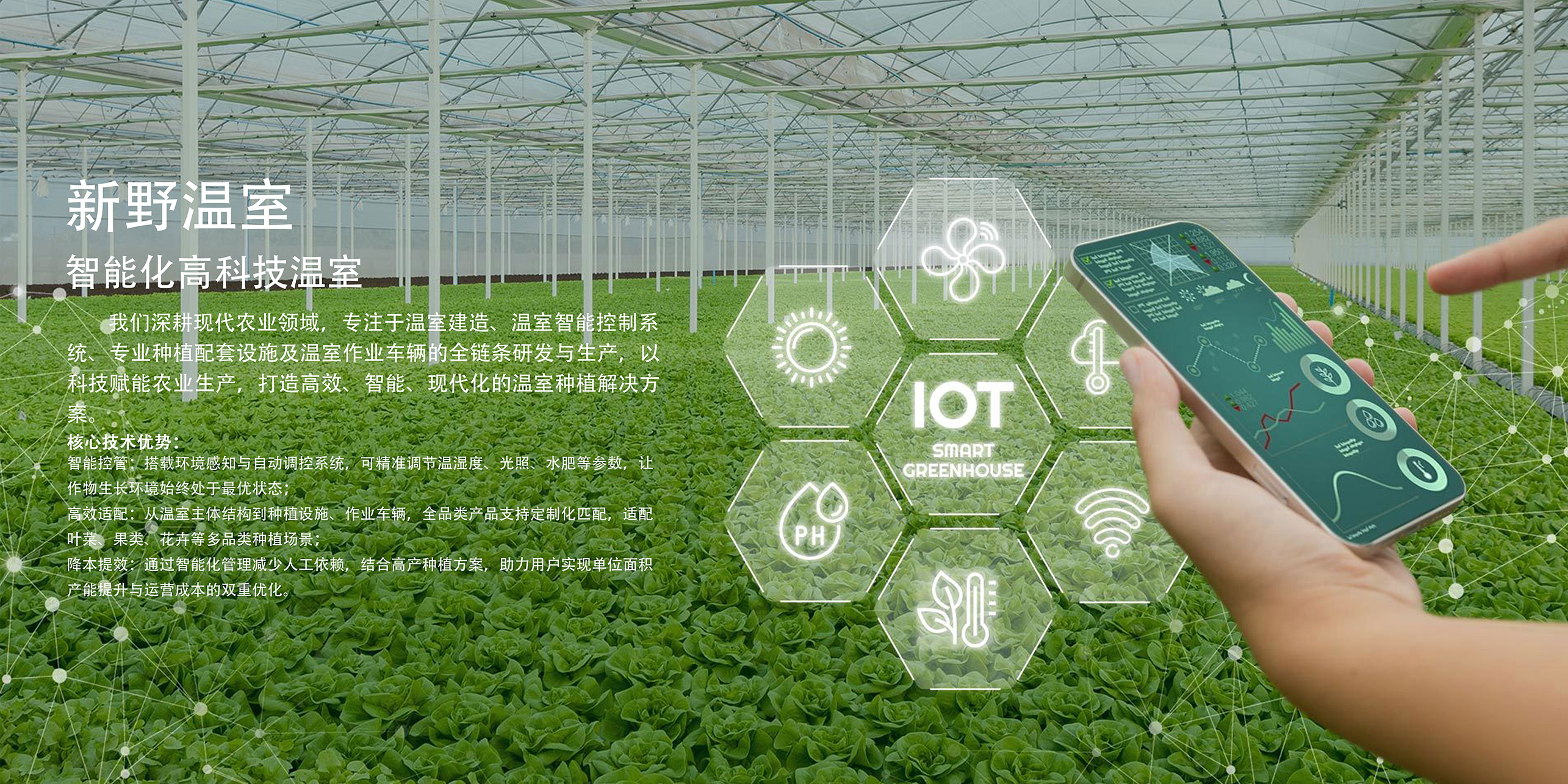 新野是专注农业工业化的高新技术企业,以“科技兴农、产业富农”为使命,现发展为集研发、设计、生产、建造、运营专注于设施农业全链条数字化解决方案,核心产品涵盖智能温室大棚、智慧农业ERP系统、自动化采收设备等,致力于以科技赋能农业生产效率提升,推动农业从传统模式向工业化、智能化转型。